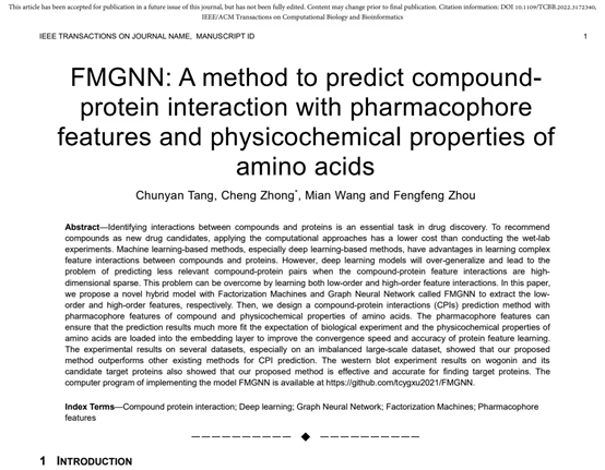 生命科学与技术学院王勉副教授、吉林大学计算机学院周丰丰教授的研究论文“FMGNN: A method to predict compound protein interaction with pharmacophore features and physicochemical properties of amino acids”被IEEE/ACM Transactions on Computational Biology and Bioinformatics期刊录用,且已经在线发表(DOI: 10.1109/TCBB.2022.3172340)。IEEE/ACM Transactions on Computational Biology and Bioinformatics是中国计算机学会CCF推荐的综合交叉学科生物信息计算领域顶级期刊。