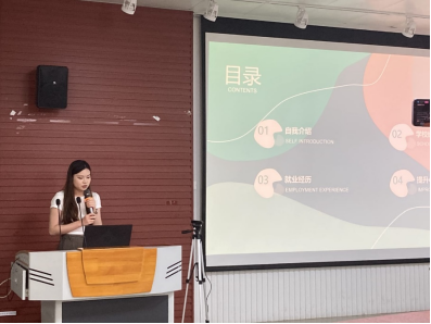 学业奖学金一等奖、陶建明奖学金等,已被广西电网有限责任公司信息中心录用。莫晓盈同学为大家介绍了研究生一、二、三年级每个阶段应该要完成的事情,并详细介绍了如何备考实习、如何选择应聘单位、如何准备简历。