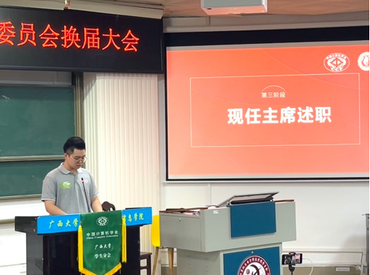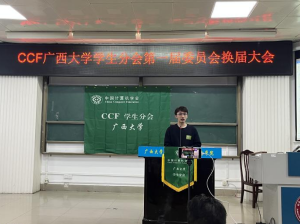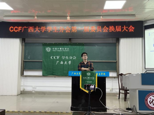 吕品老师首先致辞,他表达对现任执委工作的肯定,并鼓励分会学生会员积极利用好中国计算机学会CCF的丰富资源,不断提高专业水平。随后,分会现任主席涂欢同学就过去一年分会在学术科技服务、升学就业服务及素质技能提升三方面做工作报告。
