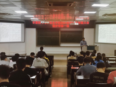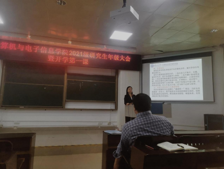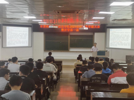 2021级研究生年级大会暨开学第一课在学院214报告厅举行。学院党委书记钟诚教授、学院党委副书记邓珍琪老师、学院研究生秘书胡亮青老师、辅导员及兼职辅导员参会。会议由学院团委副书记、辅导员杨洋老师主持。