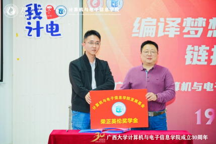 最后是“荣正英伦奖学金”签约仪式,2004级电子信息工程专业校友、广西英伦信息技术股份有限公司监事会主席赖俊全同志和韩漫
