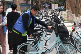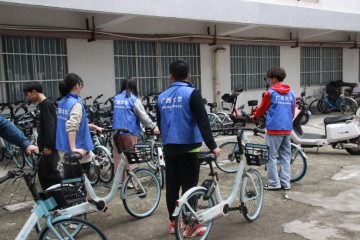 本次活动地点为校园内共享自行车停放点,志愿者首先将路边倒下的共享自行车扶起来并摆放整齐。对于占道、乱停乱放的共享自行车,志愿者搬运到停放点,擦去车身的泥渍、灰尘,并将车篮里的垃圾清理干净。志愿者分工明确、工作有序,在大家的共同努力下,共享自行车停放井然有序。