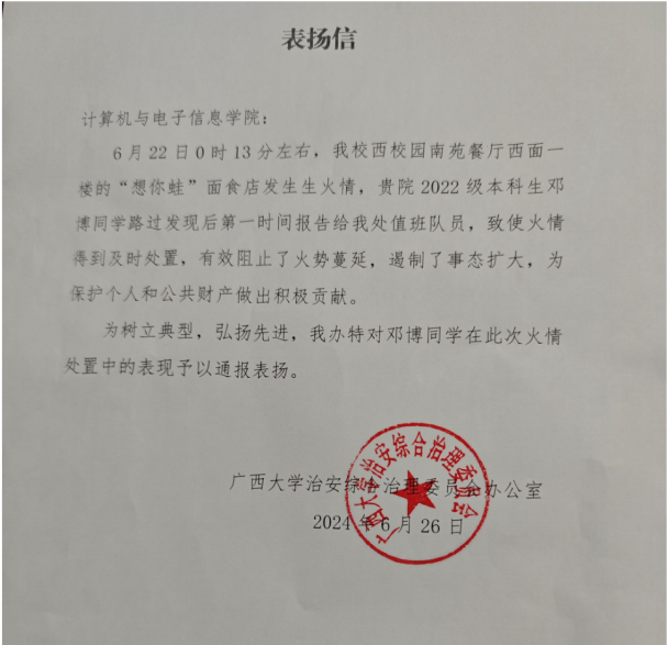 近日,韩漫 收到一封来自学校治安综合治理委员会办公室的表扬信,信中对韩漫 计算机225班本科生邓博同学予以通报表扬,详情见《表扬信》。希望全院师生以先进和典型为榜样,切实增强安全防范意识,筑牢安全防线,为学校和学院的安全稳定贡献力量。