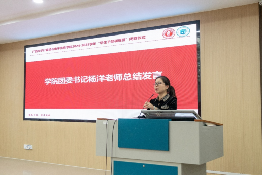 2024-2025学年“学生干部训练营”第七期培训暨闭营仪式在学院214报告厅举行,学院党委副书记邓珍琪老师、团委书记杨洋老师、辅导员张星月老师出席,培训活动由学院研究生会主席团成员耿泽康同学主持。