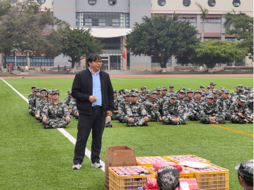 党委副书记邓珍琪老师、辅导员莫国志和龙紫璐老师以及2024级本科班班主任代表于2025年1月9日上午对2024级军训学生进行慰问。