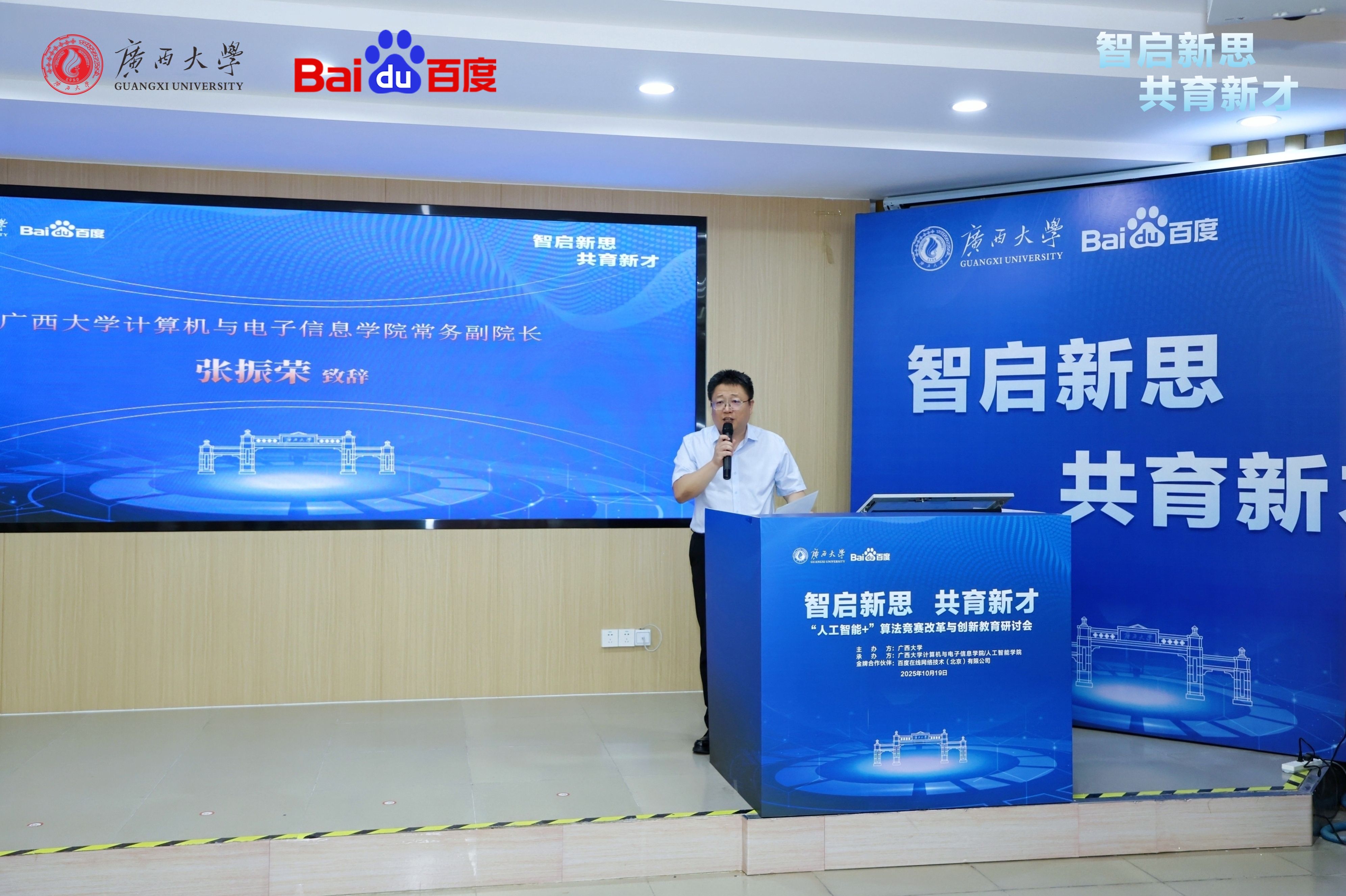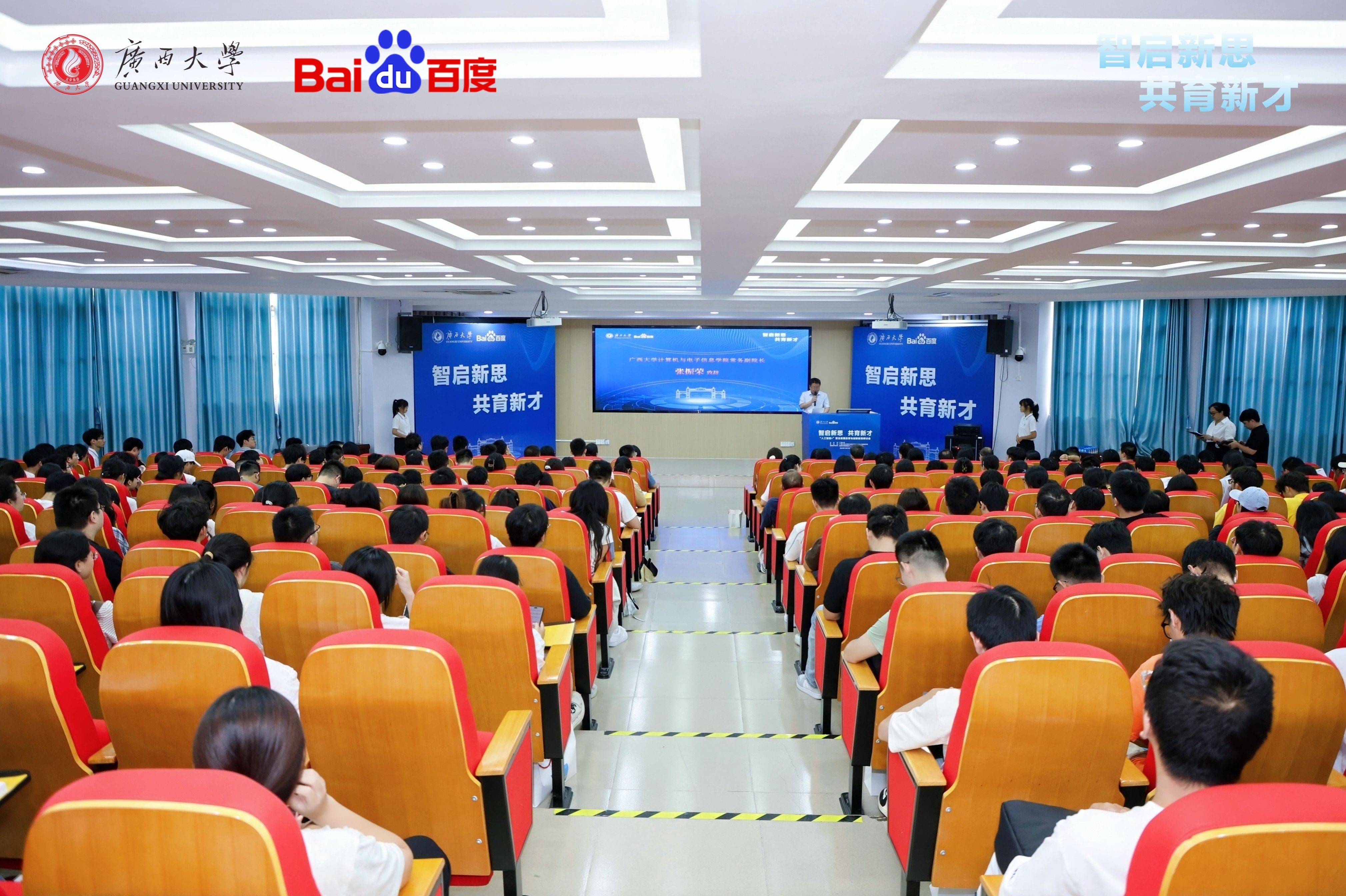 常务副院长张振荣、百度集团高校合作部副总监计湘婷出席开幕式并致辞。贵港培正数字中职学校常务副校长陆秋利、广西民族大学人工智能学院院长葛丽娜、南宁职业技术大学人工智能学院院长易著梁,广西民族大学、广西科技大学、广西师范大学、南宁职业技术大学、南宁师范大学、广西财经学院等兄弟院校的院长、教授和专家老师们出席会议。韩漫