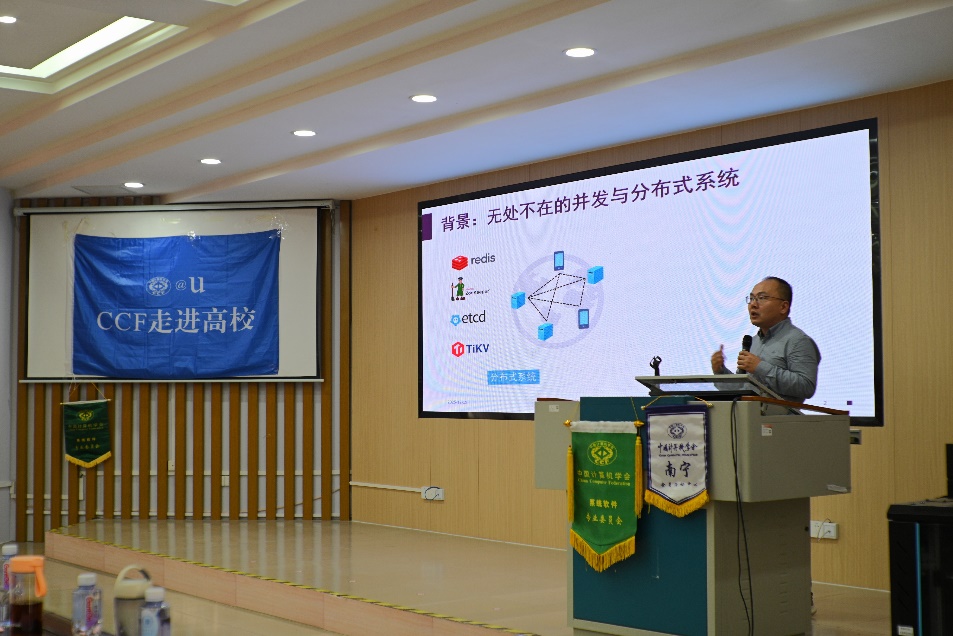 随后,南京大学黄宇教授在会上作了题为《基于模型与代码一致性的并发与分布式系统验证框架》的学术报告。黄教授指出,并发与分布式系统虽提升了容错与性能,但也带来了正确性保障的难题。