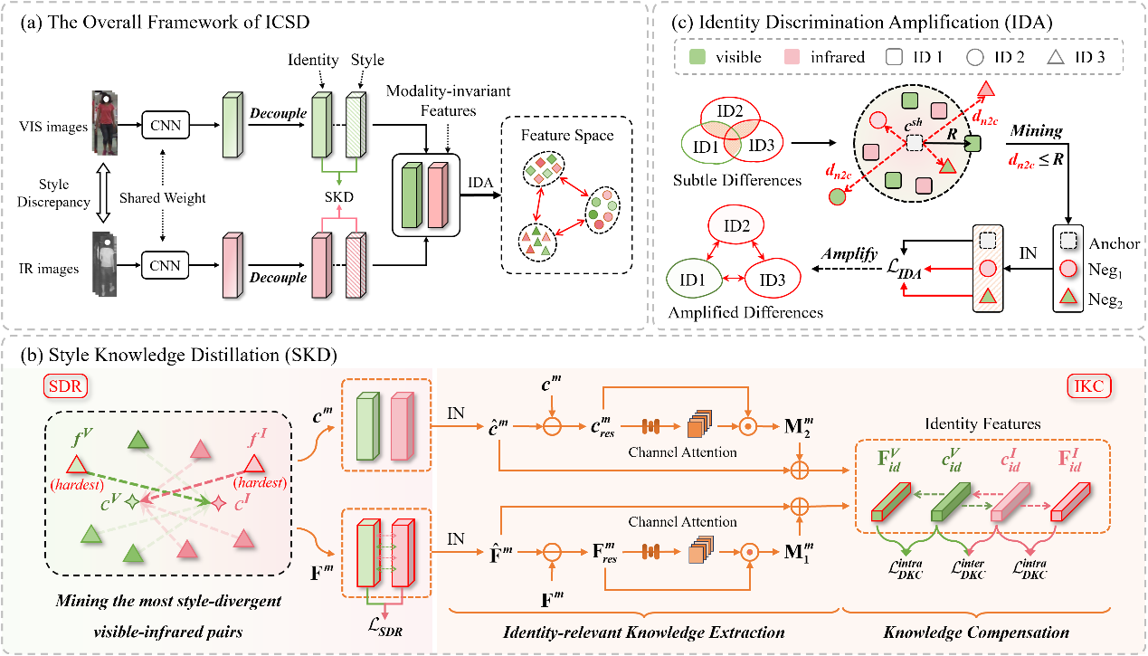 近日,韩漫 凌永国老师与其指导的2023级硕士研究生胡子豪等合作的学术论文《Identity-Compensated Style Distillation for Visible-Infrared Person Re-Identification》成功被国际图像处理顶级期刊《IEEE Transactions on Image Processing》(IEEE TIP)录用。韩漫 为论文的第一署名单位,合作单位包括特伦托大学、合肥工业大学和南洋理工大学。 IEEE TIP是国际电气工程师协会(IEEE)下图像处理领域的顶级期刊,是中国科学院 SCI 一区 TOP 期刊、中国计算机学会 CCF 推荐的计算机图形学与多媒体领域的三大 A 类期刊之一,2024-2025年最新影响因子为 13.7。 可见光-红外行人重识别(Visible-Infrared Person Re-Identification, VI-ReID)是计算机视觉与智能安防领域的关键研究方向,旨在实现可见光与红外跨模态下的行人目标精准匹配。近年来,基于模态对齐与风格学习的重识别方法取得明显进展,但由于模态差异大、身份语义易丢失、细粒度特征难捕捉,现有方法在模态风格对齐与身份特征判别能力方面仍存在不足,跨模态检索精度难以进一步提升。针对上述问题,团队提出了一种全新的身份补偿式风格蒸馏(ICSD)框架,采用“对齐-补偿-增强”的范式。该方法通过风格知识蒸馏模块(SKD)实现模态风格对齐与身份语义补偿,并结合身份判别增强模块(IDA)强化细粒度身份差异,在缩小跨模态鸿沟的同时最大化保留判别性特征。实验结果表明,ICSD 在 SYSU-MM01、RegDB、LLCM 三大主流数据集上均能实现更稳定、更精准的跨模态检索,性能显著优于当前主流方法。 本研究获国家自然科学基金、广西自然科学基金等多个项目支持。 论文链接://ieeexplore-ieee-org-s.vpn.hanmanhub.com:8118/document/11435248 一审一校:刘金辉、黄千芊 二审二校:蒙祖强 三审三校:赵进创