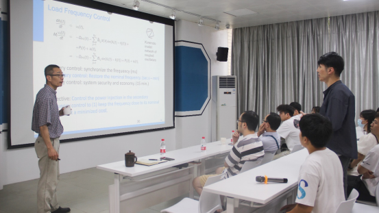 林海翔教授首先介绍了自己的一些主要经历、工作环境及其部分的研究成果。然后介绍了可再生能源和清洁交通的大背景,简述了多车充电时电网压力大、电动汽车的电池充电时间长、行驶距离短等现存的问题。由此提出了一个多学科决策支持体系和一个可行的解决方案:通过更换充电站的电池并使用备用的电动汽车电池作为存储系统来集成它们(G2V和V2G)。接下来,林海翔教授向同学们讲述了多学科决策支持体系的例子:研究未来分布式发电系统的建模和针对风光发电的随机波动设计多层分布式控制算法;利用过去三十多年的全球风光强度历史数据进行地理分布的风能和光伏发电的稳定性分析与优化;使用城市数字孪生模型对电动汽车使用以及充电和可调度容量建模和预测。随后,林海翔教授对预测模型的数学建模进行了详细解读。