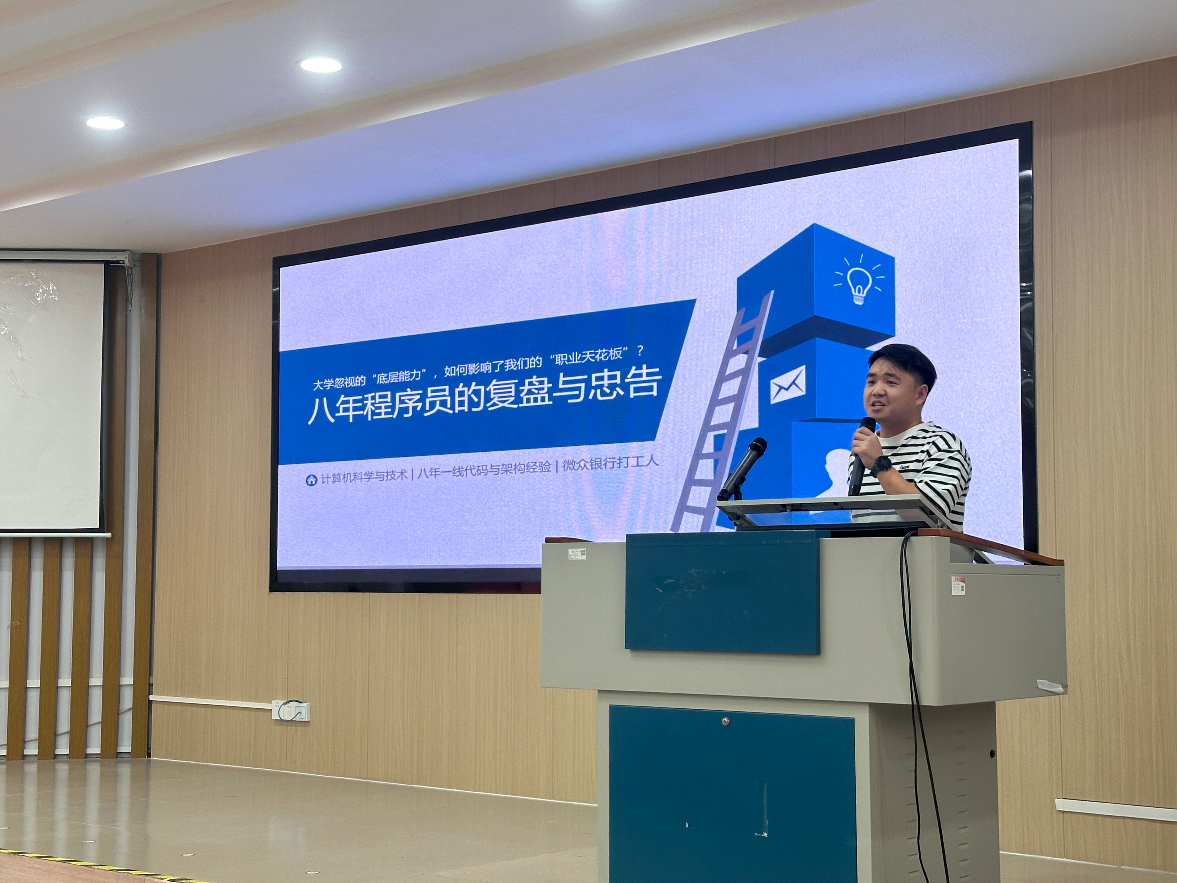 他以大学忽视的‘底层能力’如何影响职业天花板为题,向同学们分享其八年程序员的复盘与忠告。他建议同学们“以终为始”,对标大厂要求系统性学习;必须夯实技术基础,通过实践融会贯通;鼓励大家通过考研拓宽视野、提升长期竞争力。面对AI浪潮,他提醒同学们应积极拥抱趋势,但绝不能依赖工具“偷懒”,核心的分析与解决问题能力仍需通过扎实编码来锻造。