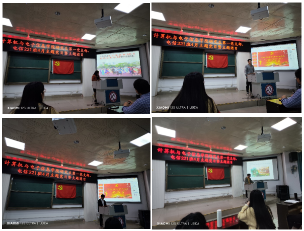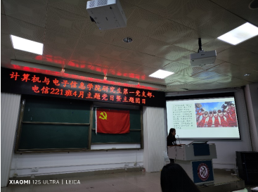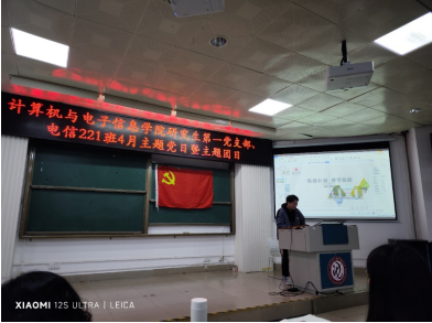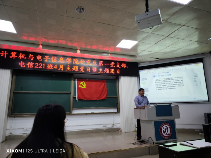 2023年4月25日,计算机与电子信息学院研究生第一党支部、电信类221班在学院214报告厅,共同组织开展2023年4月份主题党日和主题团日活动。本次活动由党支部书记邓珍琪同志主持,研究生第一党支部全体党员和电子信息类221班全体同学参加。