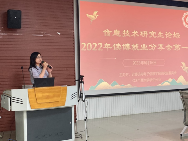学业奖学金一等奖、陶建明奖学金等,已被广西电网有限责任公司信息中心录用。莫晓盈同学为大家介绍了研究生一、二、三年级每个阶段应该要完成的事情,并详细介绍了如何备考实习、如何选择应聘单位、如何准备简历。