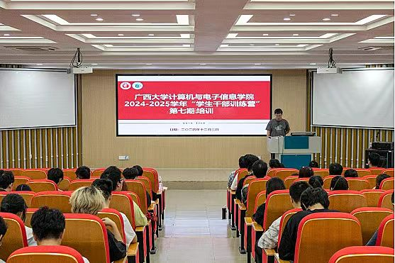 2024-2025学年“学生干部训练营”第七期培训暨闭营仪式在学院214报告厅举行,学院党委副书记邓珍琪老师、团委书记杨洋老师、辅导员张星月老师出席,培训活动由学院研究生会主席团成员耿泽康同学主持。