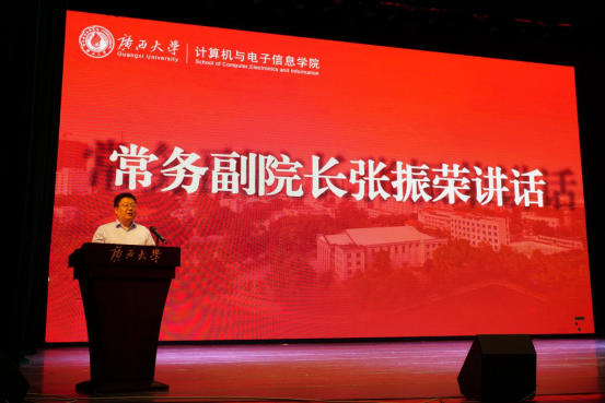 张振荣常务副院长以学院32年发展历程为脉络,从1993年建院至今,学院已形成“5个本科专业+多学科硕士方向”的培养体系。面向新生,他提出四点殷切期望:要心怀“国之大者”,让每一行代码、每一个电路设计与国家发展同频共振;要锤炼过硬本领,从程序设计、智能算法等基础学起,筑牢专业根基;要勇攀科技高峰,在芯片设计、基础软件等“卡脖子”领域敢闯“无人区”;要恪守科技伦理,让技术始终服务于人民福祉与八桂大地发展。