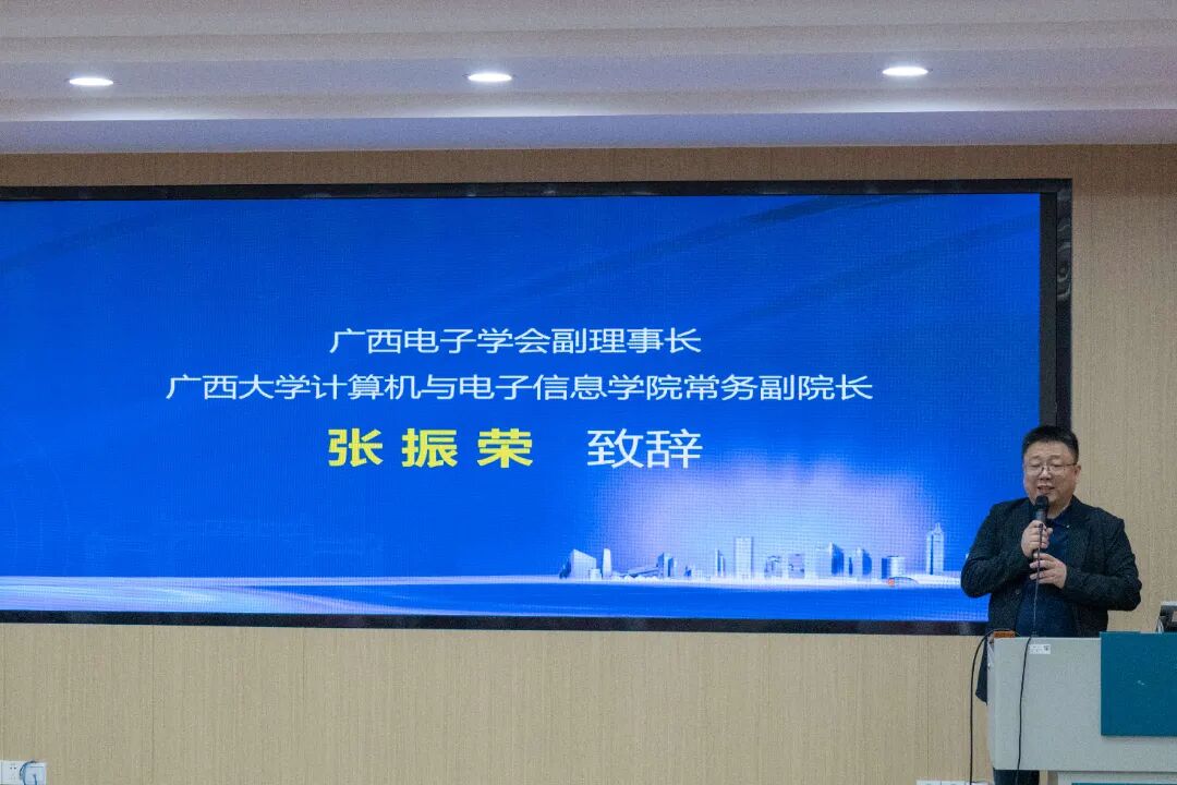 人工智能学院常务副院长张振荣致辞表示:广西电子学会人工智能专委会的成立,正是应时代之需、顺发展之势的重要举措,对于推动我区人工智能技术的创新与应用,促进相关产业的快速发展,具有十分重要的意义。