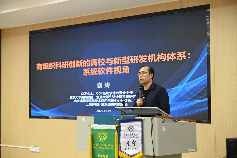 2025年12月19日下午,中国计算机学会(CCF)系统软件专委会走进广西大学,并在计算机与电子信息学院成功举办“人工智能时代计算机学科发展与科技创新机制研讨会”。本次会议由中国计算机学会主办,CCF系统软件专委会,广西大学计算机与电子信息学院,CCF南宁,广西智能数字服务技术创新中心,广西高校并行分布与智能计算重点实验室共同承办,由广西大学计算机与电子信息学院研究生会、CCF广西大学学生分会协办。会议汇聚了来自北京大学、南京大学、华中科技大学等多所顶尖高校的知名学者,共同为在场师生呈现了一场聚焦前沿科技与学科发展的学术盛宴。