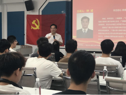 在交流环节中,同学们积极提问,钟诚老师耐心解答。他向同学们讲述了自己作为一名党员、一专业教师、广西首批科学家精神宣讲团成员持续学习、不断实践的初心,并以此激励青年学生对科学的热爱和追求;同时,他向同学们提出了3个方面的建议:一是在政治思想上,要坚定不移听党话跟党走,以服务人民为自我目标;二是在学习科研上,要勤奋钻研,以勤补拙,积极参加研讨、学术会议交流,以了解最新学科发展动态和研究热点,善于思考,富于联想持之以恒,勇于实践;三是努力养成好的生活习惯,以多种方式加强身体素质锻炼,保持心态阳光、昂扬向上的精神状态。