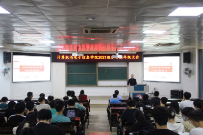 在学院214报告厅,组织召开2021级本科生年级大会。学院党委副书记邓珍琪老师、学院辅导员刘智斌老师、学院教学秘书甘瑜萍老师和罗程老师、计算机类专业213班班主任白琳老师、兼职辅导员路佳和李琳同志、以及2021级全体本科生参加会议。会议由刘智斌老师主持。