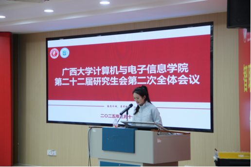张星月老师对研究生会的工作进行总结,她首先肯定了研究生会上学期取得的成绩,并对今年研究生会的工作提出三点希望:一是加强学校-学院-班级三级联动,提升服务同学的精准度和实效性;二是立足时代前沿,发挥学科优势,结合人工智能专业开展特色精品活动;三是提高工作主动性,创新服务方式,精益求精,查漏补缺,切实提升同学们的参与感和获得感。