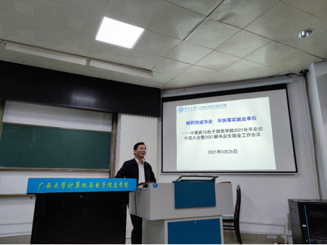 2021年3月26日下午,计算机与电子信息学院在214报告厅,召开2021年毕业班年级大会暨2021届毕业生就业工作会议,学院党委书记、院长钟诚老师,学院党委副书记邓珍琪老师,学院辅导员顾春雨、唐印浒老师,以及2021届全体本科和研究生毕业生参加会议。