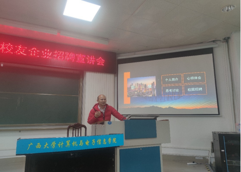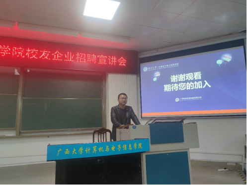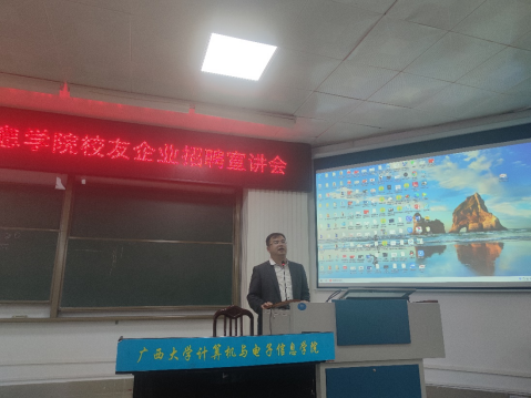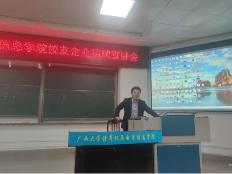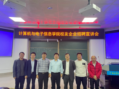 2021年12月16日下午,计算机与电子信息学院与校友企业合作,在学院214报告厅召开校友企业招聘宣讲会,校友企业广西尚信品科技有限公司、广西迅驰信息科技有限公司、广西优乐俊智能机器人有限公司和广西码农信息科技有限公司、以及广西天海信息科技有限公司等5家企业到学院开展2022届毕业生招聘宣讲。