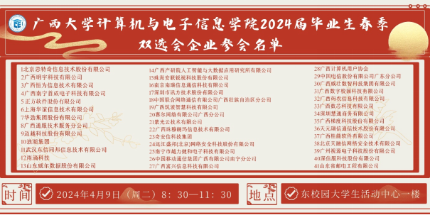 为推动计算机与电子信息学院毕业生更高质量、更充分就业,2024年4月9日,我院在东校园大学生活动中心一楼成功举办2024届毕业生春季双选会。广西区内外41家企事业单位、校友企业为我院毕业生提供900多个就业岗位,我院500余名毕业生积极参加,现场人头攒动,气氛热烈。