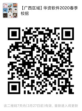 华资软件春季校园招聘将推出五期互动分享交流会,请于327前进入微信群,欢迎各位邀请同学、朋友进群。